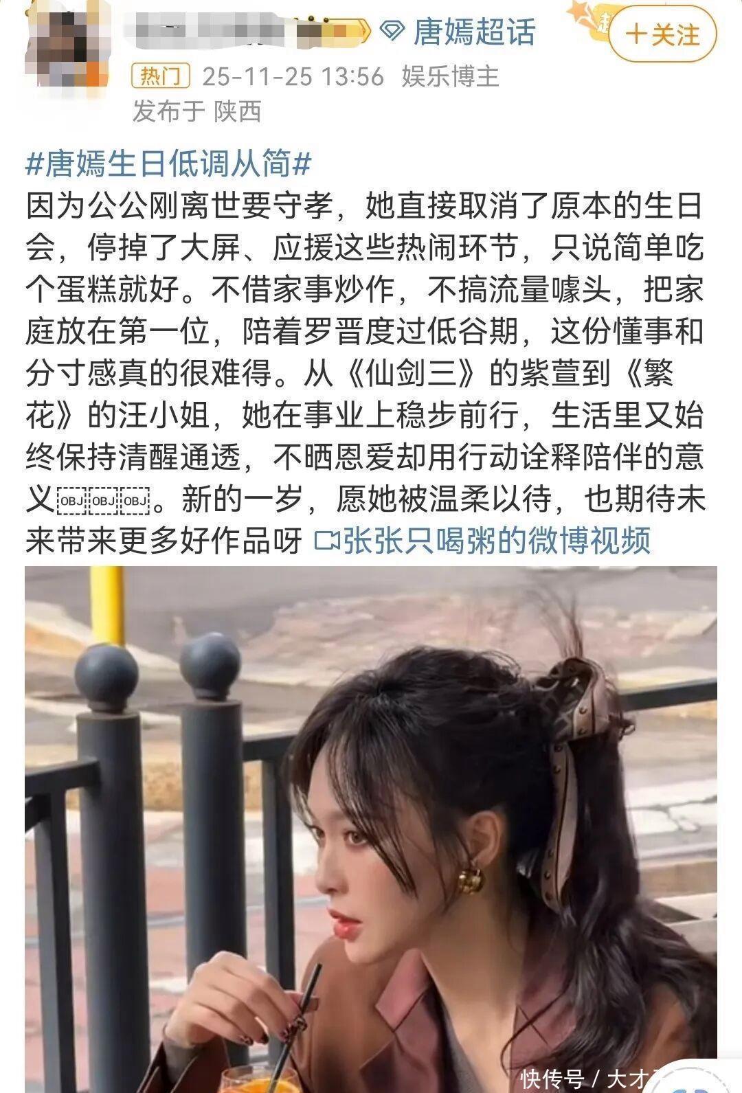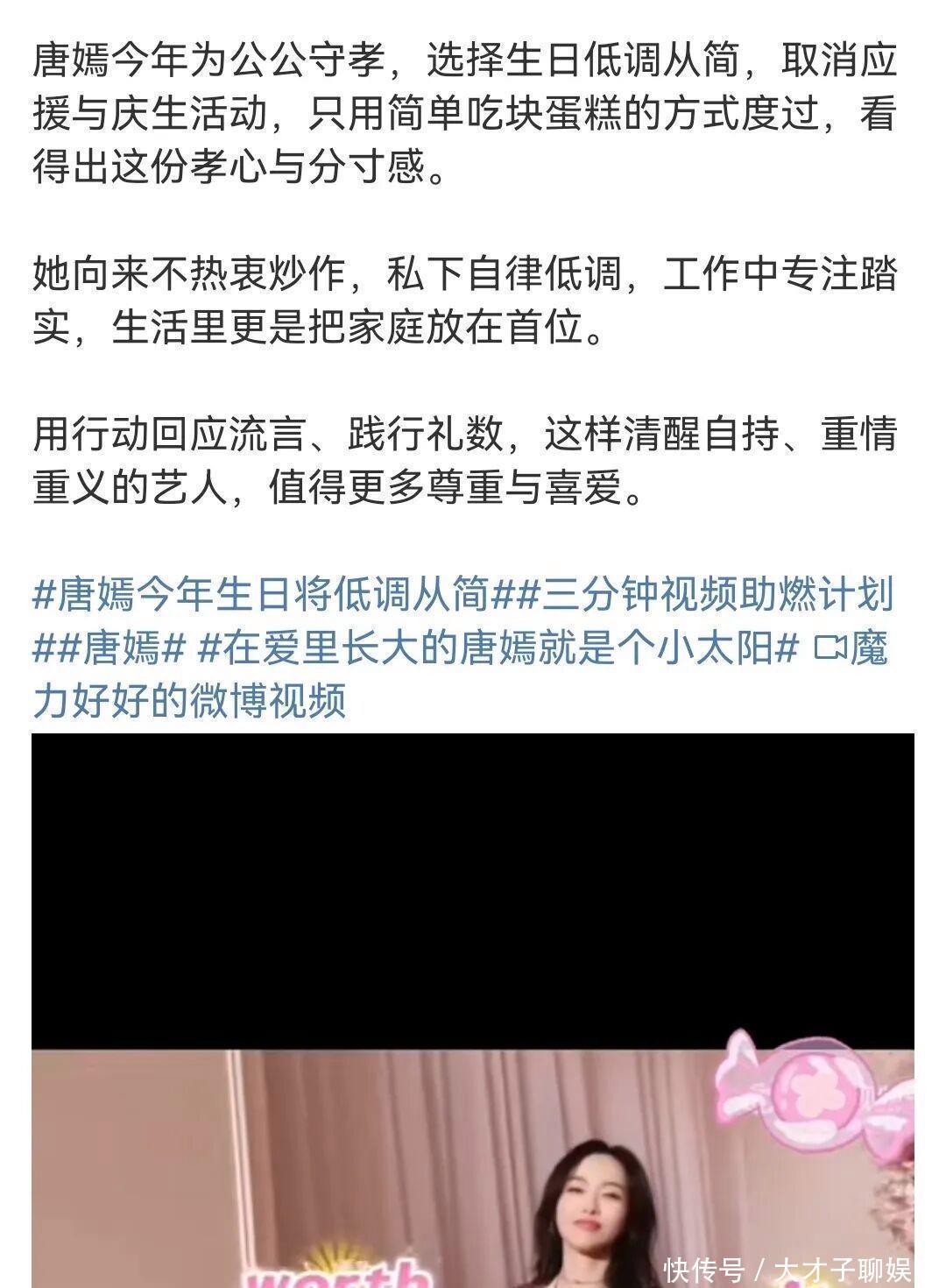 如果说葬礼上的陪伴是对谣言的有力回应,那么两天后唐嫣的决定,则彻底终结了所有揣测。11�日,唐嫣在粉丝超话发布短文,语气平和却态度明确:取消今年的生日会,“当下不适宜举办大型庆祝活动”,简单度过即可。